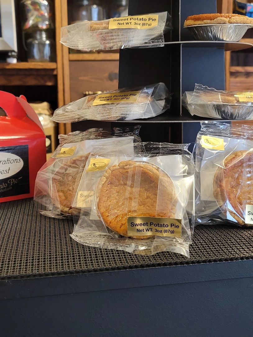 Five mini sweet potato pies that are 3 inches each! They are packaged to secure the pies and to maintains the pies freshness - they are ready for you to take and eat!